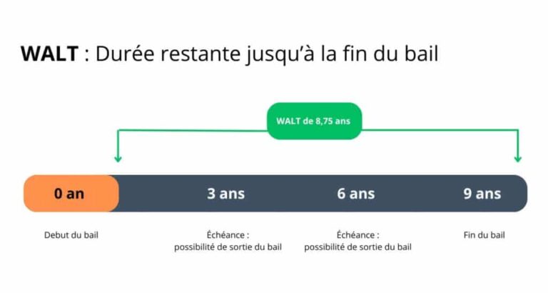 Le WALT (Weighted Average Lease Term) correspond à la durée moyenne totale restante des baux, toujours pondérée par les loyers.